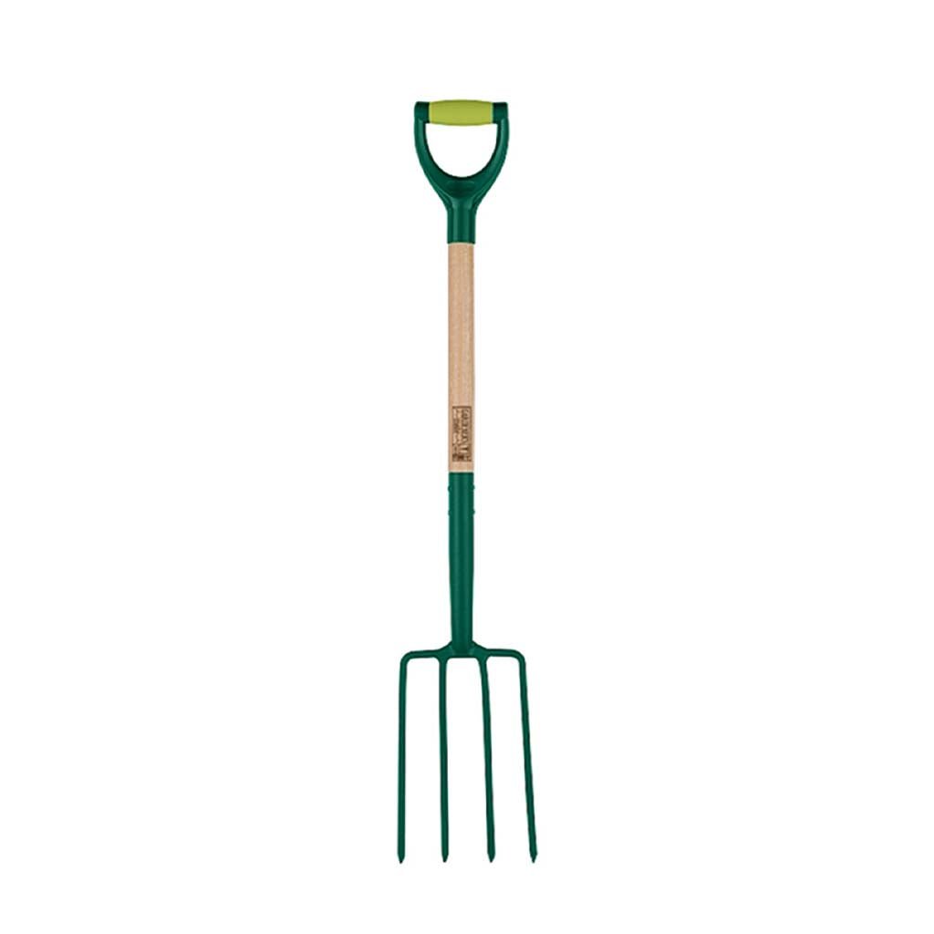 - Traditional digging fork with four strong, pointed tines and D-grip handle